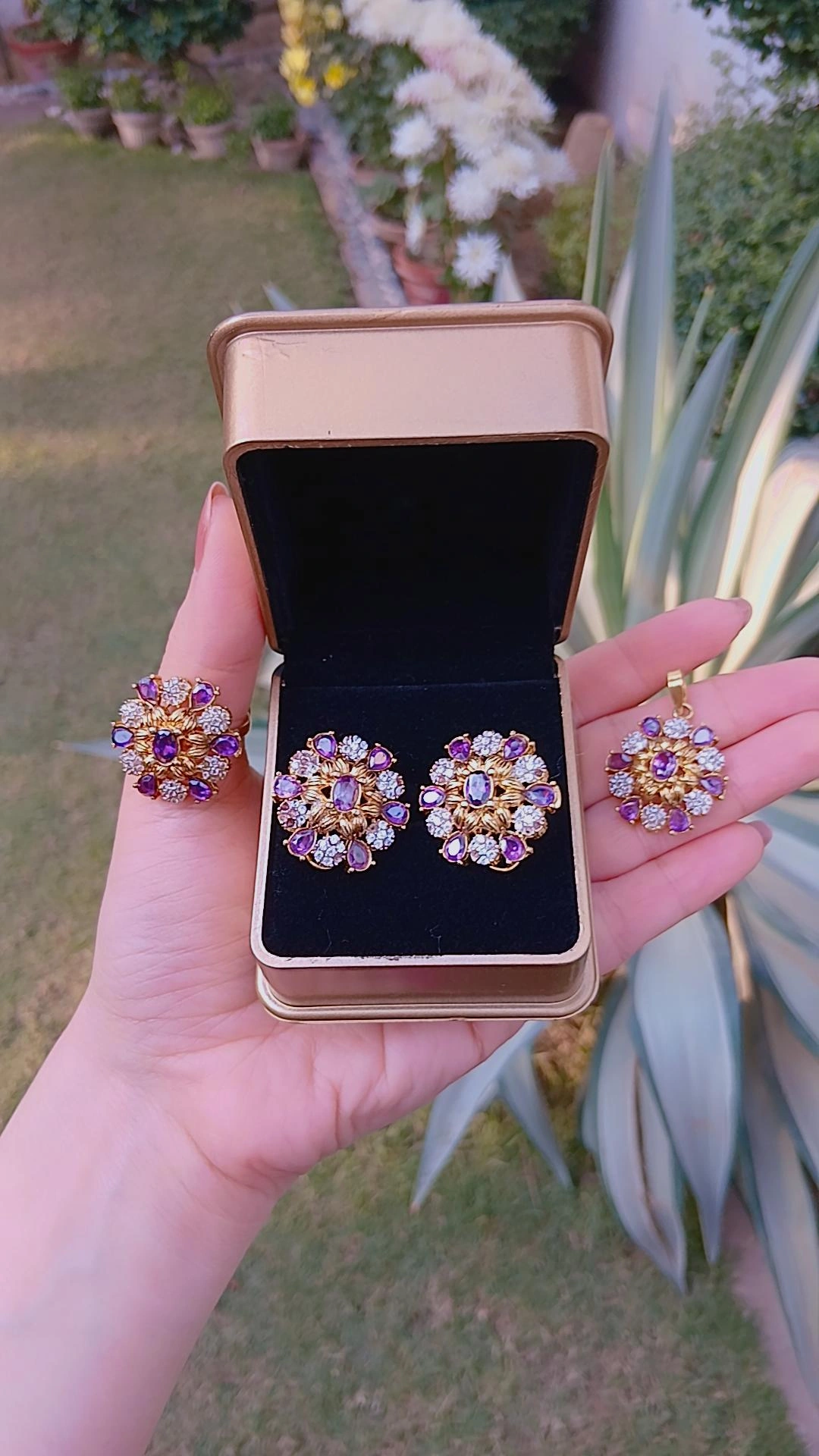 Exude royalty and sophistication with the Article 8 Gold-Plated Combo Set. This collection is designed around the captivating beauty of violet stones, offering a rich purple hue that symbolizes luxury and grace. Each piece features a central oval amethyst-toned stone, surrounded by a radiant sunburst of alternating clear crystals and teardrop-shaped violet accents.