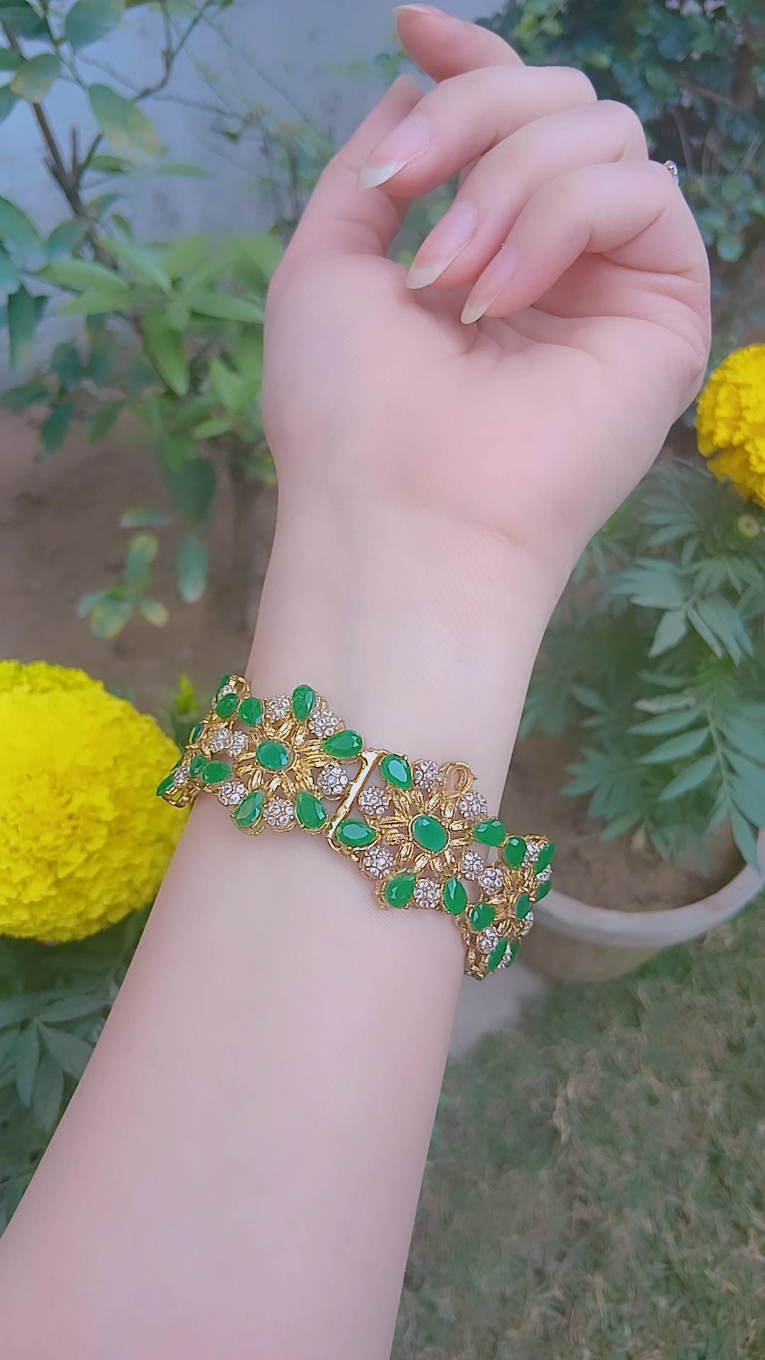 Design: Alternating emerald-green and white crystal stones in a floral-vine motif.