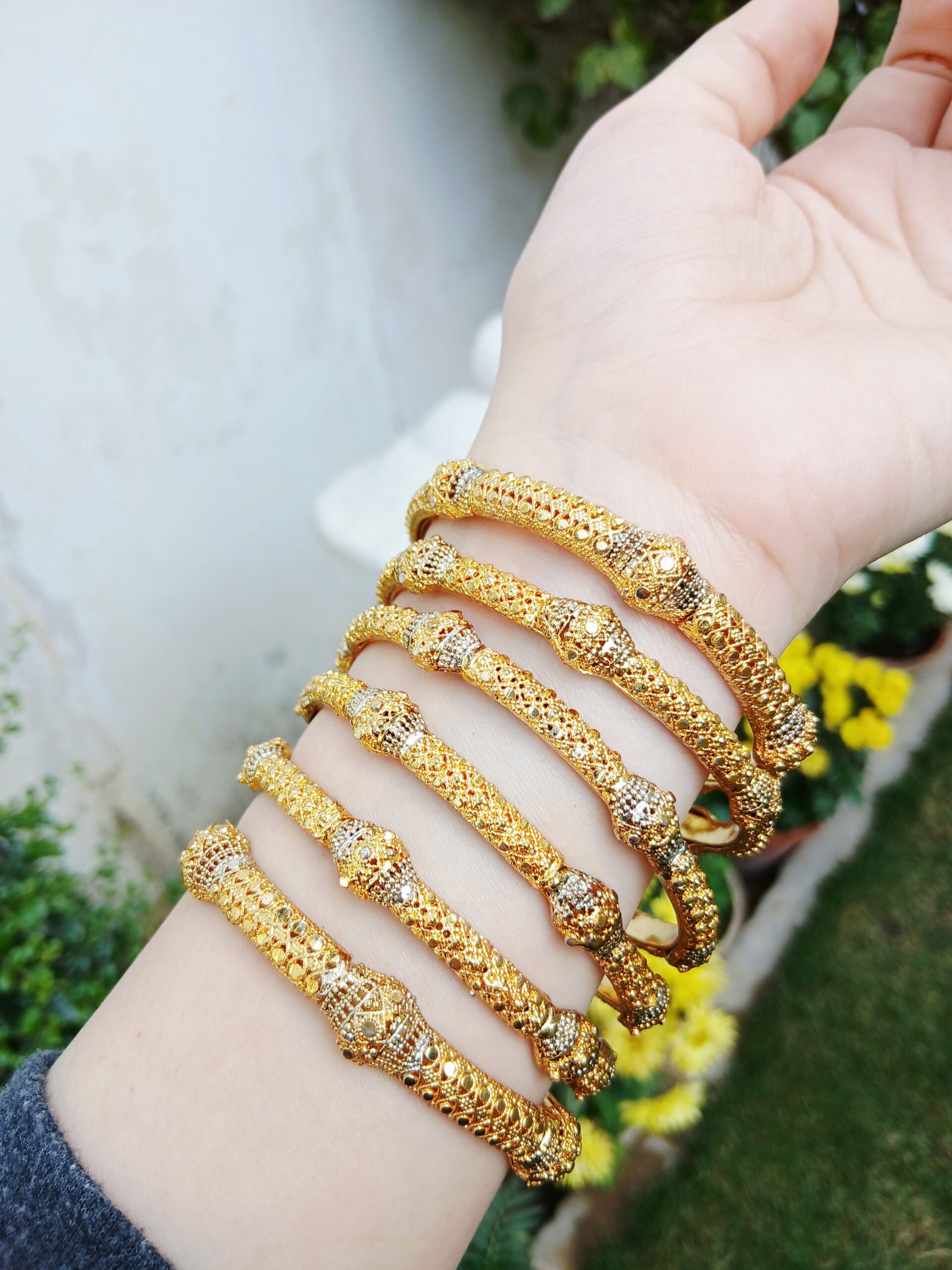 Experience the perfect harmony of traditional craftsmanship and elegant design with Article 28. This set consists of six meticulously crafted bangles, each finished in a rich, high-luster gold plating. The body of each bangle features a stunning micro-mesh or honeycomb engraving, which provides a unique tactile feel and a soft, shimmering reflection of light.