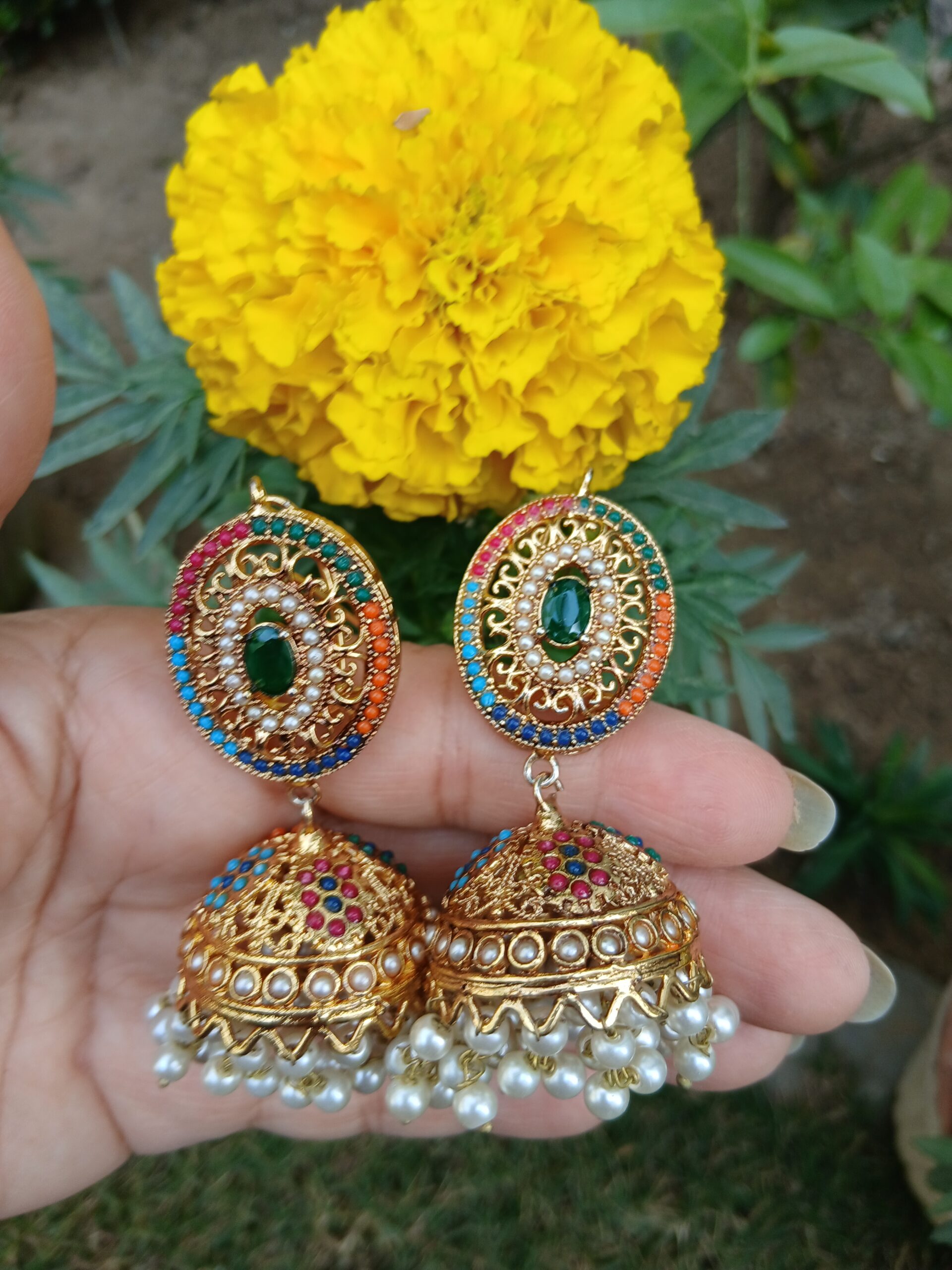 • Design: Traditional Jhumki silhouette with an emerald-green centerpiece and multicolor bead-work.