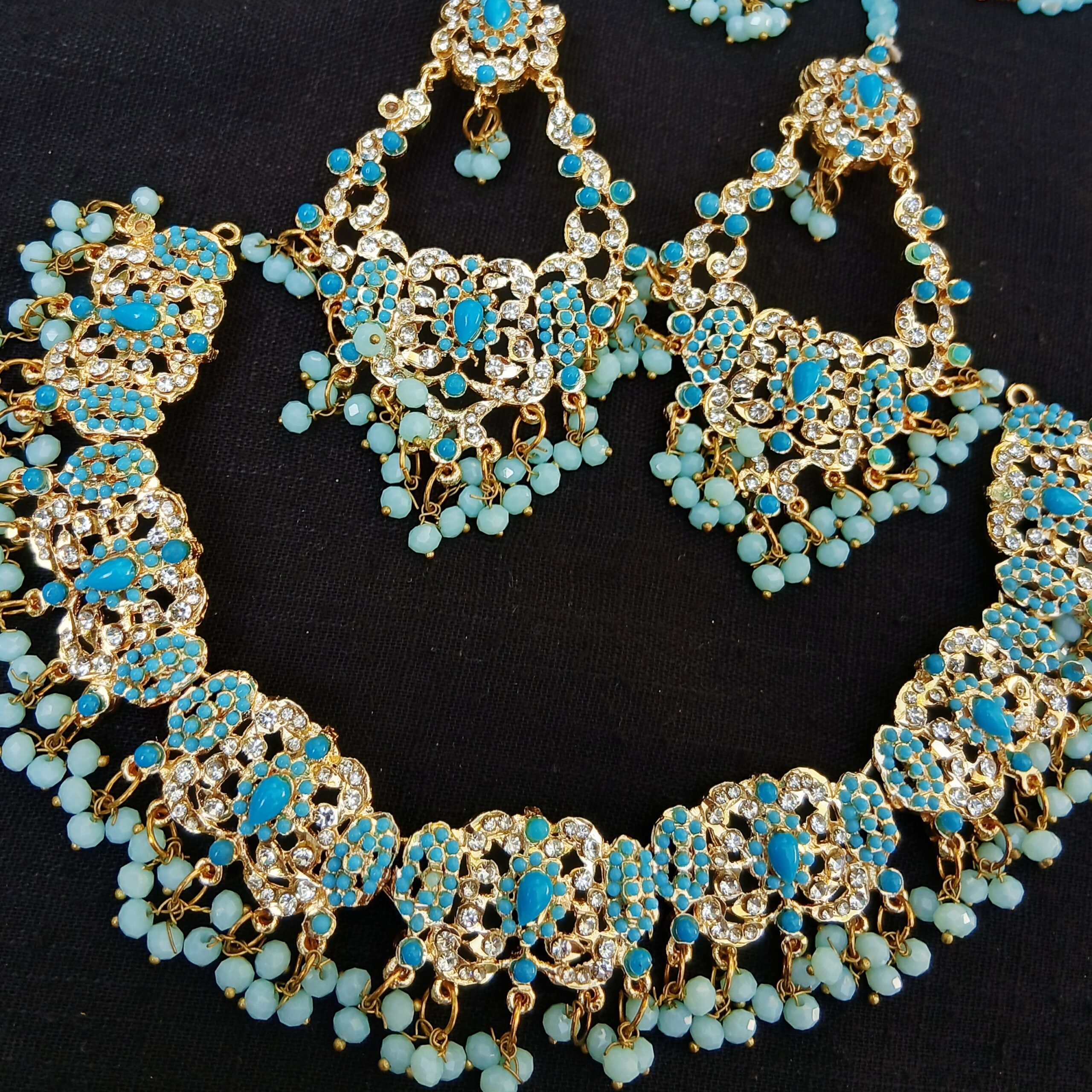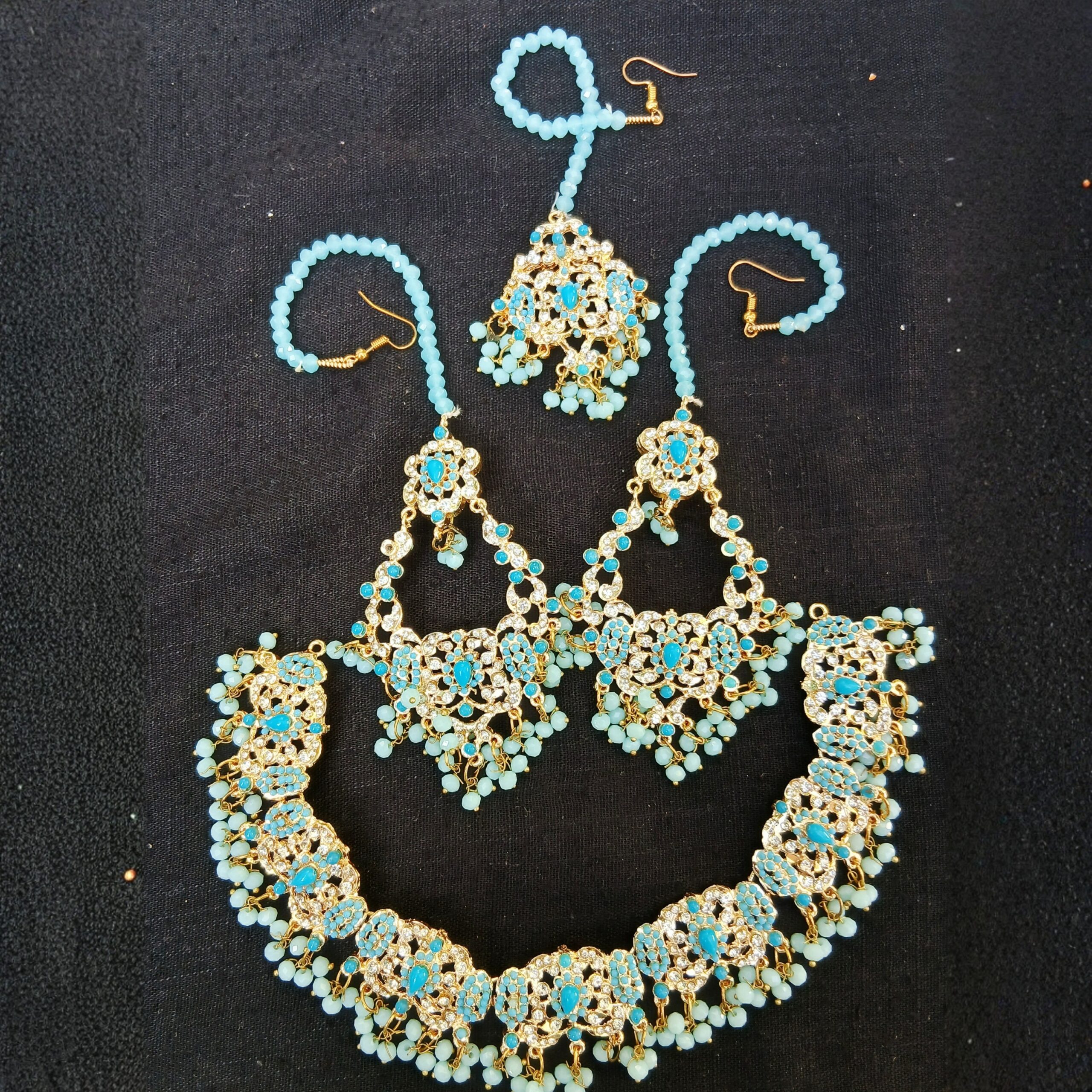 • Set Includes: One statement necklace, one pair of heavy chandelier earrings, and one matching Maang Teeka.