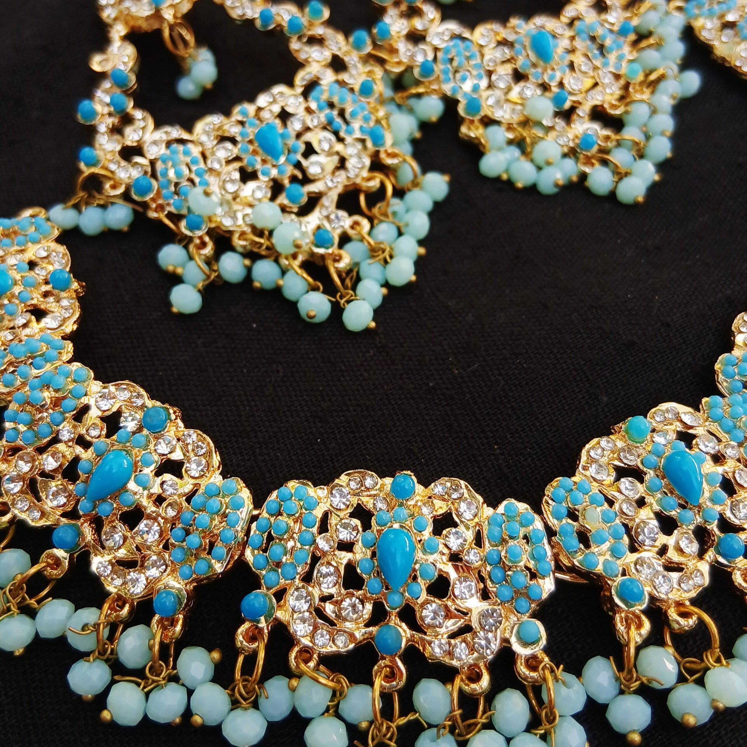 Exude classic elegance with Article A3, a premium gold-plated jewelry set featuring a detailed necklace, grand chandelier earrings, and a matching Maang Teeka. This high-quality set is meticulously handcrafted with a vibrant turquoise-green (Firoza) palette and an intricate golden filigree design.