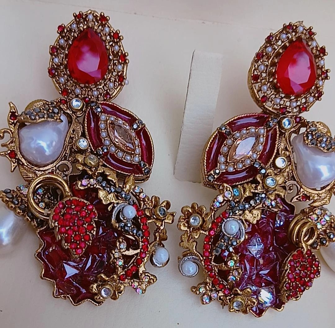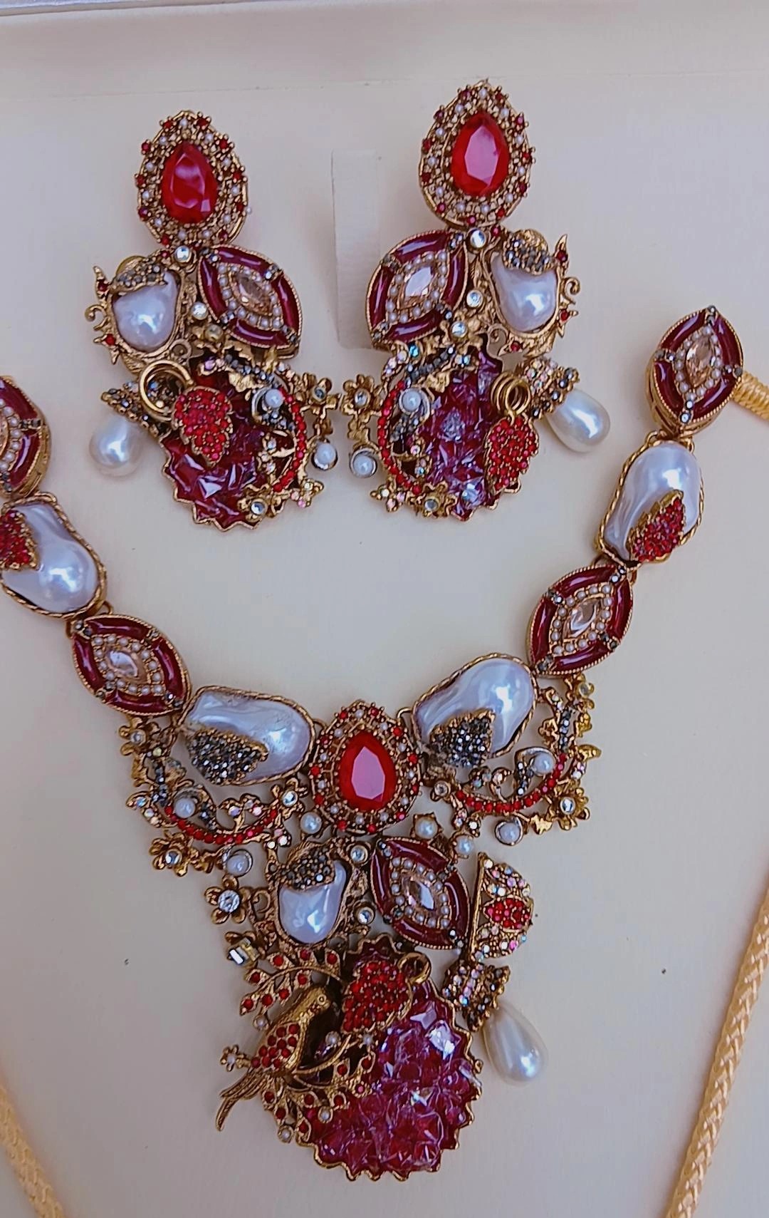Ornate Detailing: The earrings mirror the complexity of the pendant, featuring a tiered design with a ruby stud and a heavy, pearl-accented drop.