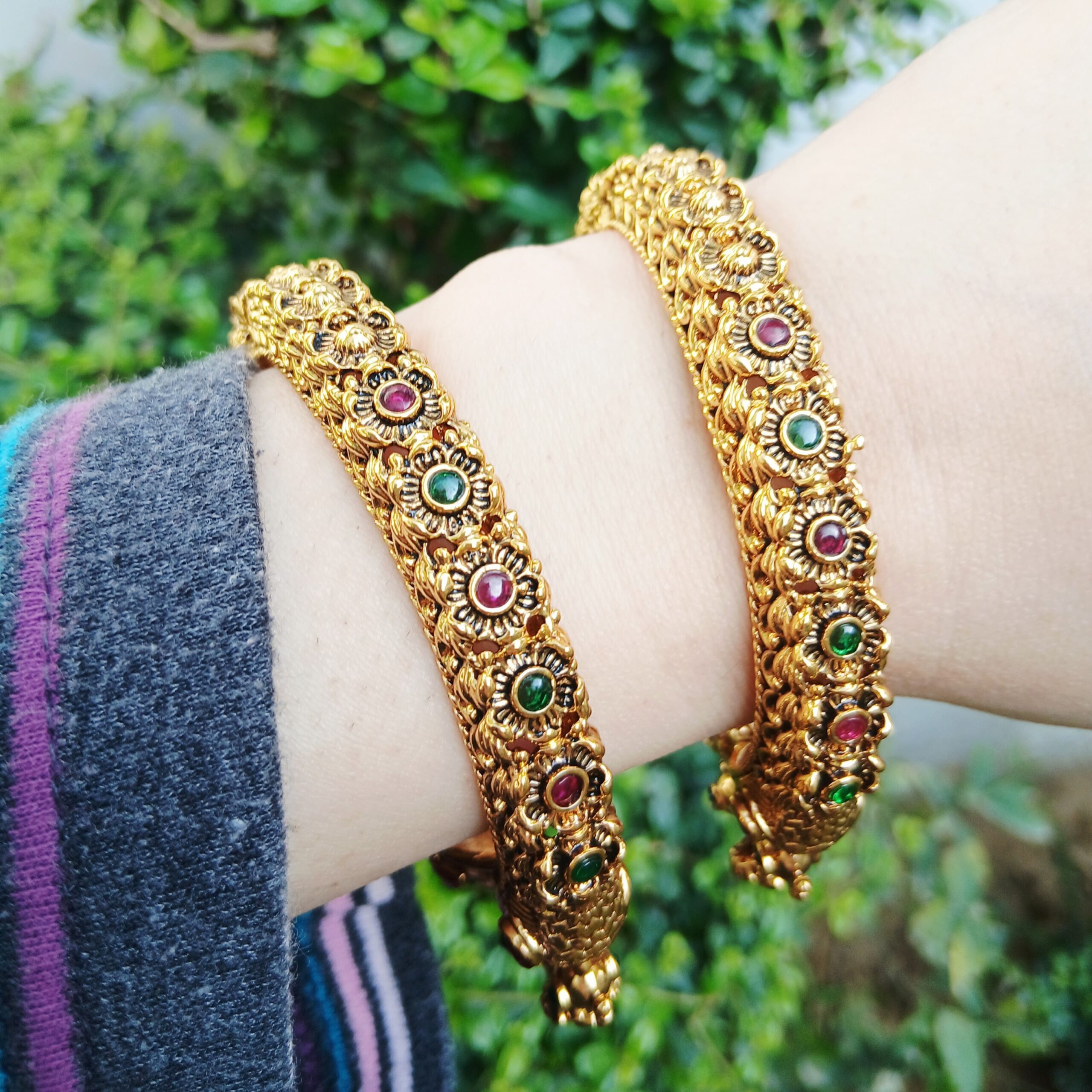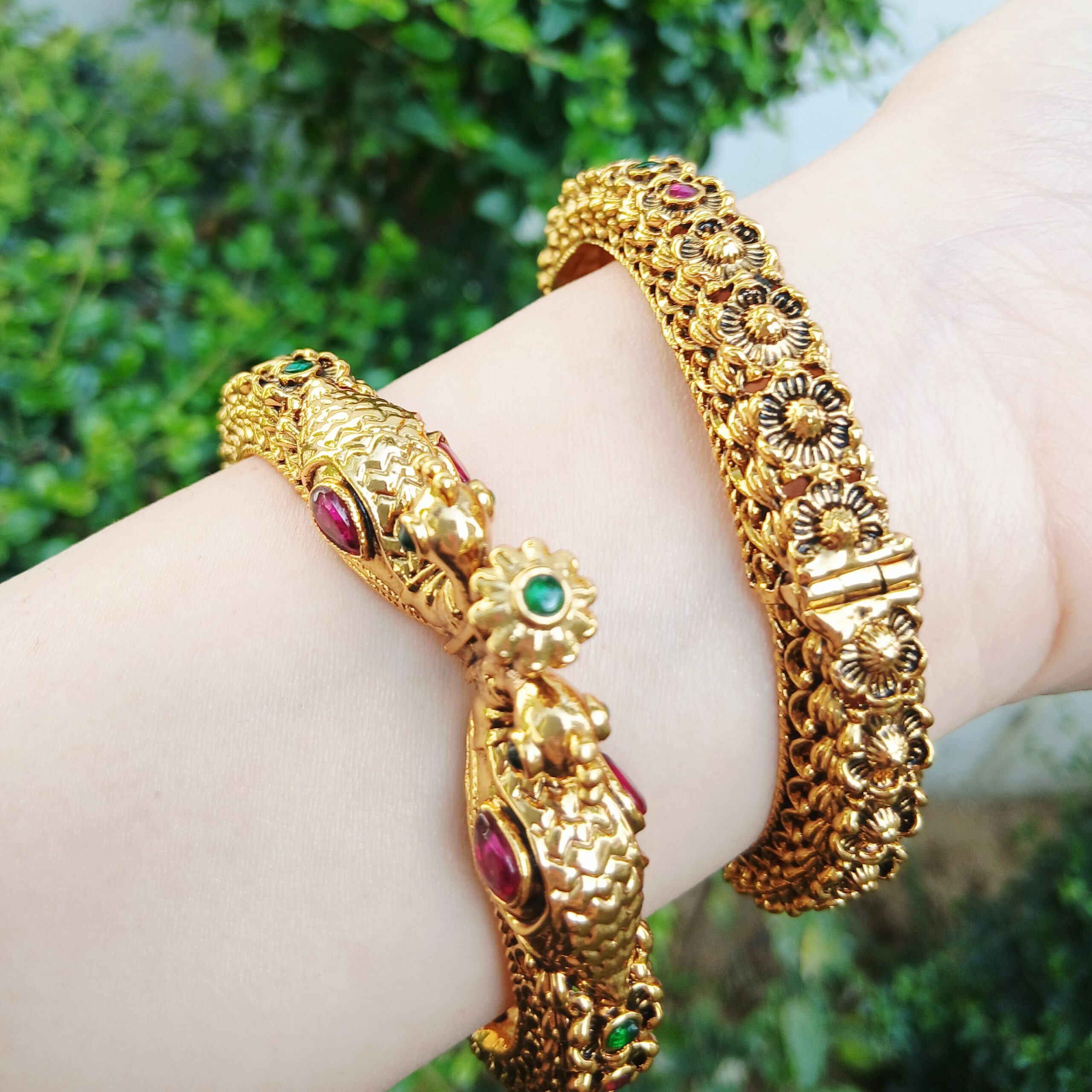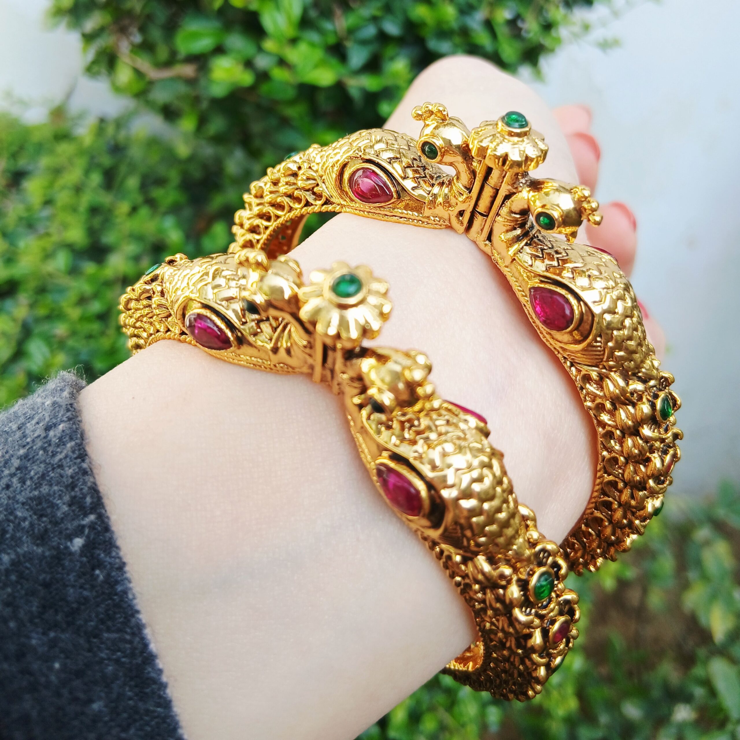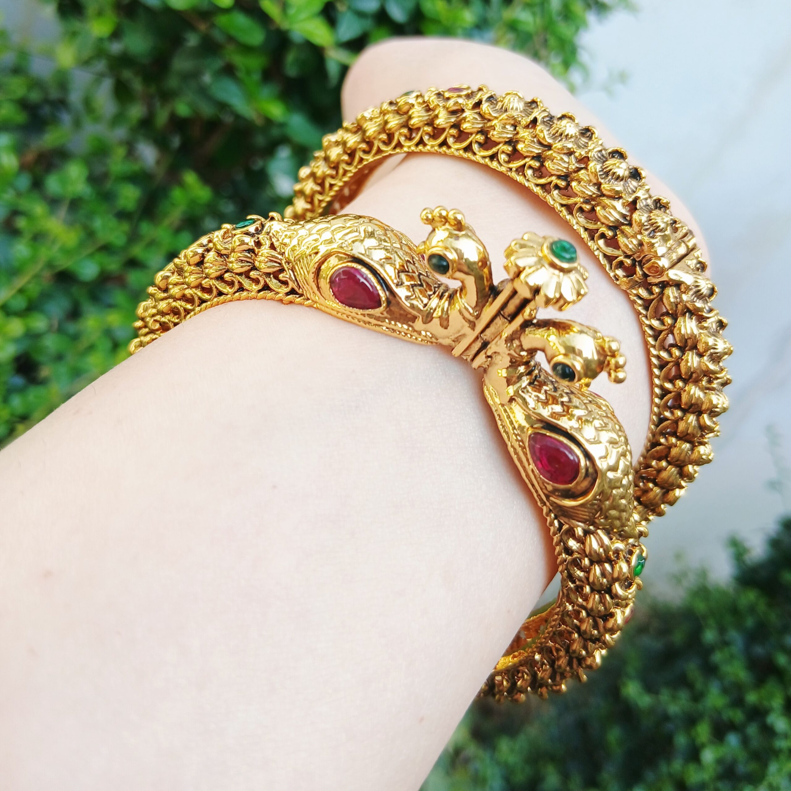 The design is elevated by faceted teardrop ruby stones and sparkling emerald-green crystal eyes, adding a brilliant pop of color to the lustrous gold finish. Each bangle is meticulously sculpted with floral and textured patterns that wrap around the entire circumference. For maximum comfort and security, Article 15 features a robust openable hinge mechanism with a floral-capped pin, allowing the bangle to open wide for easy wear. This set is the ultimate accessory for brides or for making a grand entrance at high-profile festive events.