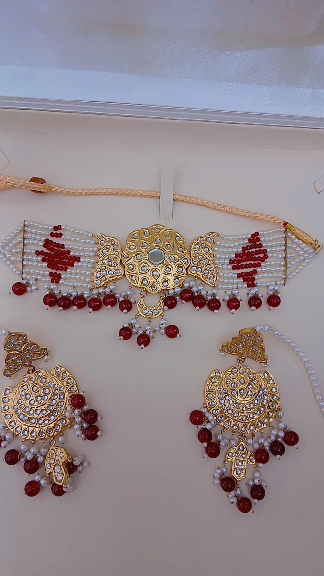 Ruby-Red Accents: The lower edge of the choker and the earrings are finished with a rhythmic row of polished ruby-red beads and tiny pearls, providing a rich pop of color.