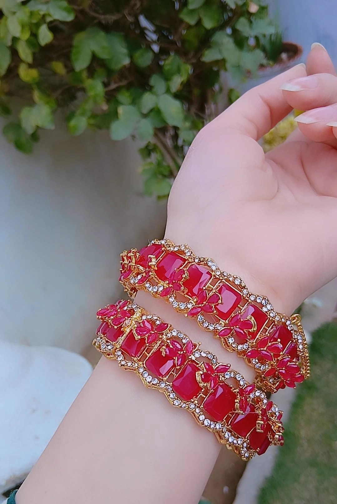 Elevate your festive attire with the breathtaking warmth and luxury of Article 37. This pair of gold-plated bangles is a masterpiece of color, centered around a series of large, vibrant ruby-red rectangular gems that capture the light with deep, rich tones. Each primary stone is elegantly separated by a ruby-red floral cluster made of delicate marquise-cut stones, adding a layer of intricate botanical texture to the design.